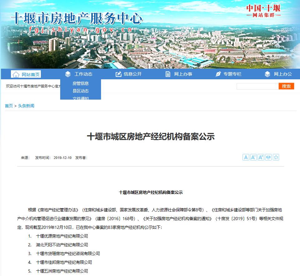 2019年12月10日十堰市房地产服务中心公布了我市83家已备案的房地产中介机构,提醒市民在交易过程中审慎选择已备案的中介,我公司作为合法备案的中介机构,将一如既往地为全市市民提供全面、周到、热情、细致的服务。